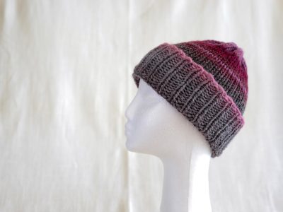 Denna tunna mössa i rosa och grå ull är fluffig med en mjuk känsla. Det är underbar att ha under nästan hela året, men framförallt under vår och höst.